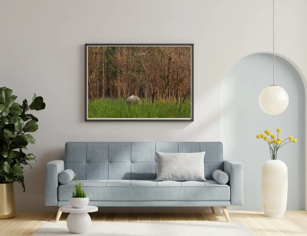 A zoned-out view of a rhino against a wide, open expanse brings a sense of scale and solitude. Surrounded by land and sky, the rhino appears both mighty and alone, a quiet monarch of its world. This image highlights the beauty of space, the stillness of presence, and the silent dominance of a creature built for survival.