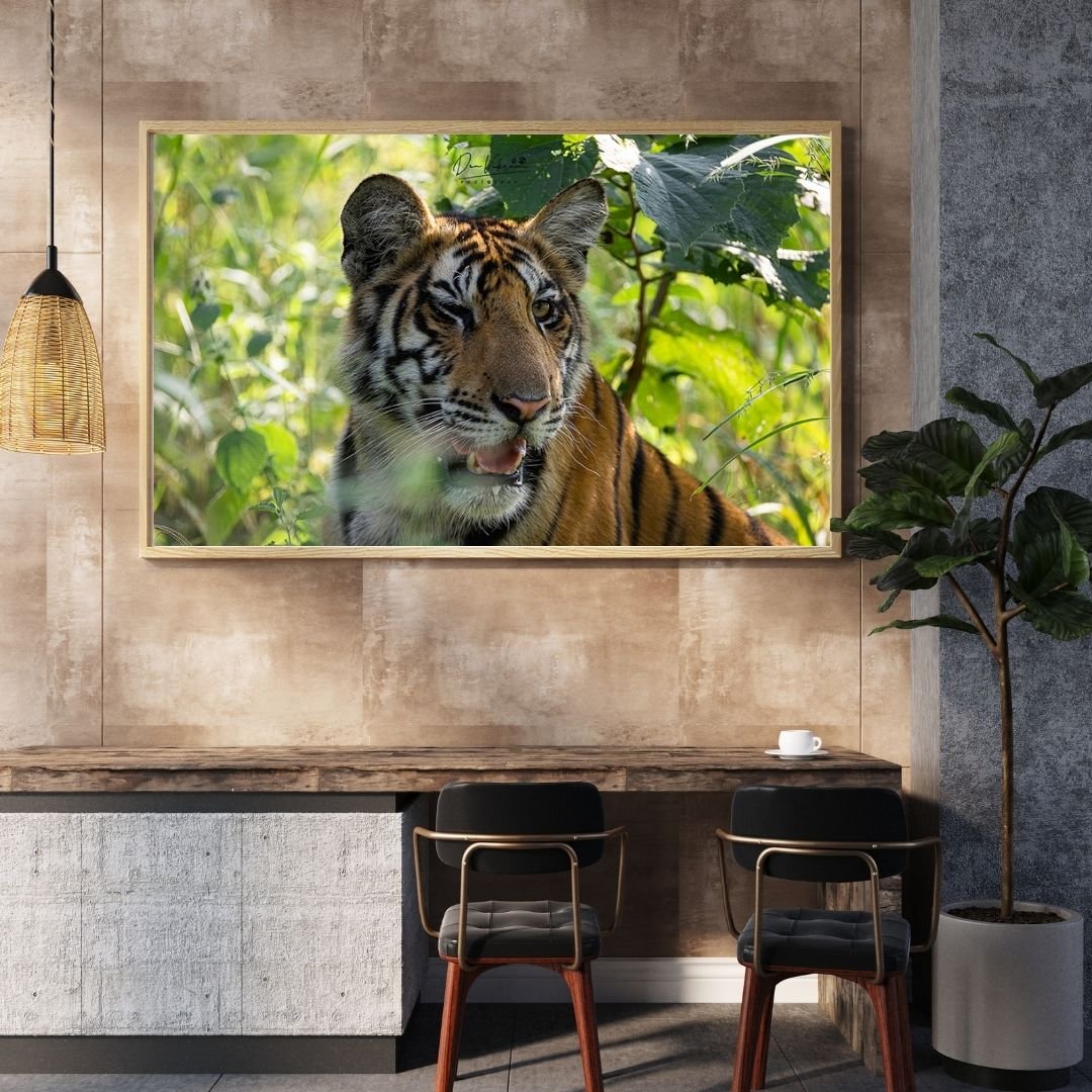The Royal Bengal Tiger is a majestic mammal and the largest of all big cats in India. Found in dense forests, grasslands, and mangrove swamps, it thrives in the wild landscapes of the Indian subcontinent. With its striking orange coat patterned with bold black stripes, sharp amber eyes, and powerful build, this tiger moves with quiet confidence. In this moment, its relaxed posture and open mouth reflect both strength and serenity — the perfect balance of a true predator at ease in its natural realm.